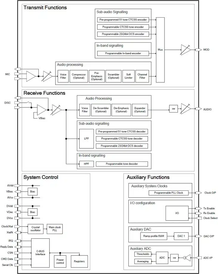 本製品は、同時にサブオーディオとインバンドトーン処理を行うことに加え、音声信号処理経路上ではユーザープログラム可能な周波数反転型の音声スクランブラ機能や音声コンパンダ/エキスパンダ、プレエンファシス/デエンファシス機能も提供し、補助機能としてプログラム可能なシステムクロック出力や補助 ADC、送信パワーランピング制御を容易にするオプションRAMDAC機能を備えた補助DACも有しております。