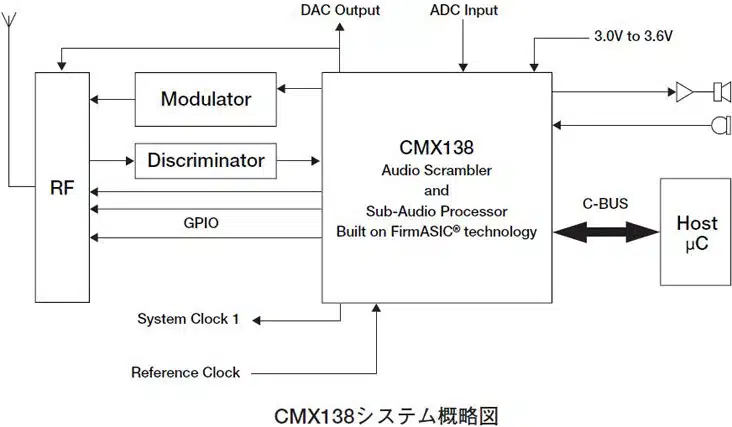 CMX138Aは、アナログトランシーバアプリケーション向けのハーフデュプレクスでの音声スクランブラ、サブオーディオ信号処理ICで、FRSやMURS、PMR446、GMRSのようなローコストのレジャータイプ無線機に最適な機能を有しております。