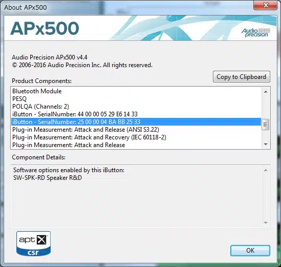 A2.APx500ソフトウェアのHelp >> Aboutをクリックしてください。About APx500ウィンドウには、ソフトウェアのバージョンとハードウェアコンポーネントの詳細が表示されます。 [Product Components]選択ボックスで、iButtonで始まる項目を探して選択します(存在する場合)。 [Component Details]ボックスに詳細が表示されます。 図の例では、SPK-RD オプションが含まれていることが確認できます。