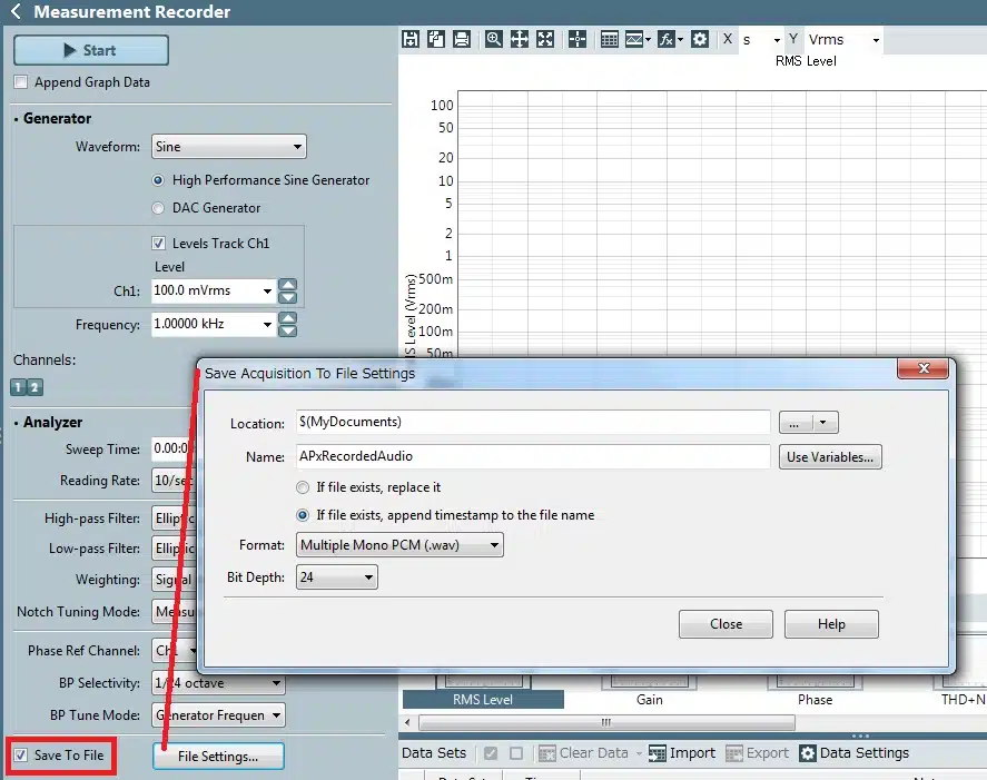 A3.測定項目によっては、測定と同時にwav等のファイル形式で保存が可能です。Measurement Recorder, Noise Recorder, PESQ, POLQA, Signal Acquisition, Signal Analyzer