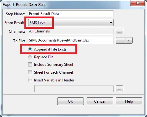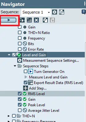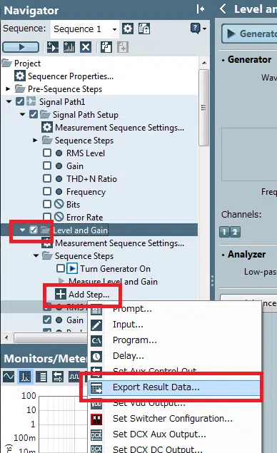 シーケンスモードのナビゲータにて、[Level and Gain」にチェックを入れ、Add Stepをの「Export result Data..」を選択してください