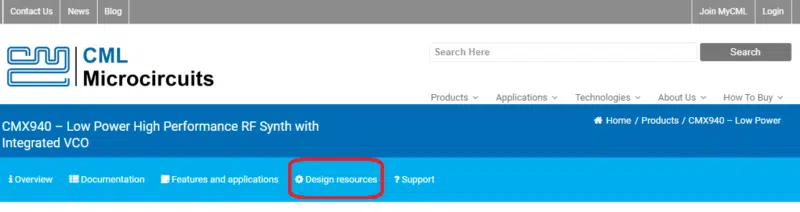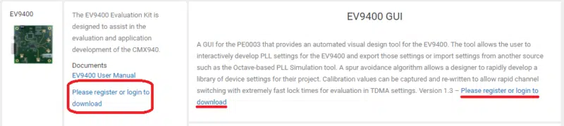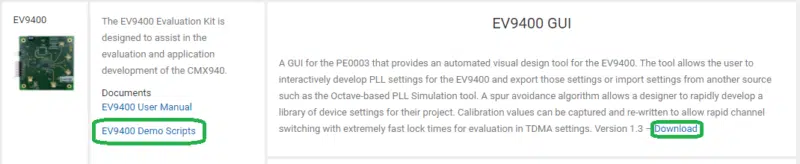 EV9400はCMX940の評価ボードとなります。CML社 CMX940のWebページ( https://www.cmlmicro.com/products/cmx940-low-power-high-performance-rf-synth-with-integrated-vco/ )から、上部水色帯の「Design resources」をクリックして下さい。