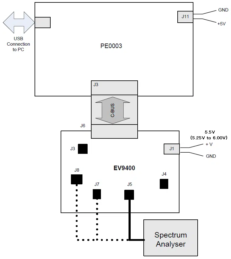 1. EV9400とPE0003(C-BUS1(J3))を接続し、それぞれに電源を接続。EV9400 User Manual の5.1 Setting-Upをご確認下さい。