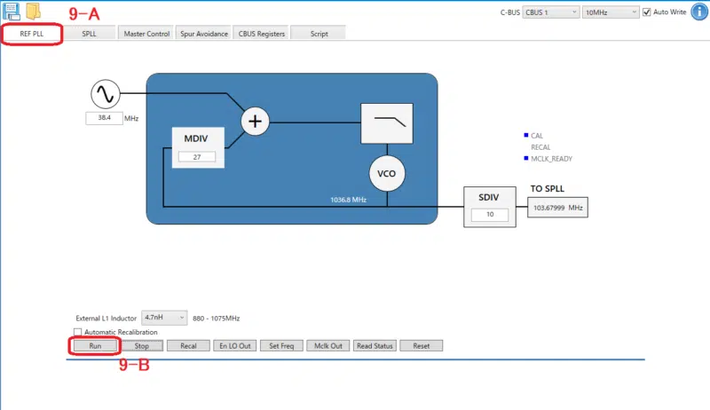 9. 「REF PLL」タブ(9-A)を選択して、「Run」ボタン(9-B)を押して下さい。