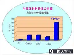ここには(図:「ダイヤモンドの特性と応用」参照)、代表的なダイヤモンドの物性だけを書いていますが、上のほうは比較的機械的な特性で、摺動摩擦が非常に低いという特性もあります。熱伝導率も他の材料と比べると何倍も大きい。ダイヤモンドは、銅と銀のほぼ5倍の熱伝導率ということが言えるわけです。半導体特性の比較を示しますとこれが代表的なもので、これはパワー系のデバイスの性能仕様でジョンソン(Johnson)という人が作ったもので、今話題のSiCなんかに比べても5倍ぐらい優れていると言われています。