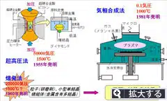 これに対して気相合成は81年の発明、一番最初に論文が出たのは76年とありますが、実際に使えるようになったのは81年の無機材研の発表からだと思います。これが1000℃で大体0.1気圧。ですから、超高圧法とは全然違う領域でやるっていうところに面白さがある。よく「超高圧法とか爆発法は平衡状態でダイヤモンドを作るが、気相合成法は非平衡状態で作っているんだ」という言い方、分類の分け方をする。それでも似たようなものがちゃんと作れるというところは、大変面白いところですね。