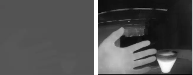 一方、我々が一般的に目にする画像(写真やTV画像のような)は、8ビット階調(RGBあるいはYUV各色8ビット)で表現されており、サーマルカメラは、より高い分解能で撮影していることになります。つまり、あるピクセルにおいて、近隣ピクセルとそれほど大きな温度差が存在しない室温環境のような場合(大抵は、Leptonの場合撮影可能なシーンダイナミックレンジ-10~+140℃のうち、屋内なら気温程度~せいぜい+20℃程度が画像内の大部分)は、近隣の点との間ではっきりとしたコントラストにはなりません。図2は、LeptonではなくBosonを用いた画像になりますが、サーマルカメラの出力そのままでは、左側のように見えます。