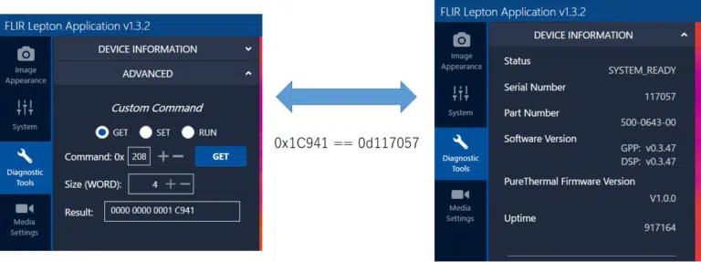 例えばLeptonのシリアル番号(SYS FLIR Serial Number)を知るにはGetを用いますが、SDK Module ID = 0x0200、Command ID = 0x08で、戻されるデータ長は4ワード(32bit4語)になりますので、Commandとして0x0208、Size (WORD)には4を設定して、GETボタンを押すと、シリアル番号がResultフィールドに返されます。この値は16進数4ワードで返されていますが、それを10進数に直すと、おなじDiagnostic ToolsのDEVICE INFORMATIONに記載されているSerial Numberと一致することを確認いただけるものと思います。
