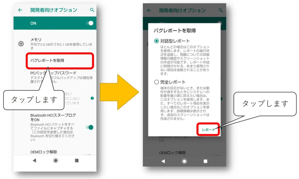 開発者向けオプション画面から[バグレポートを取得]を行います。