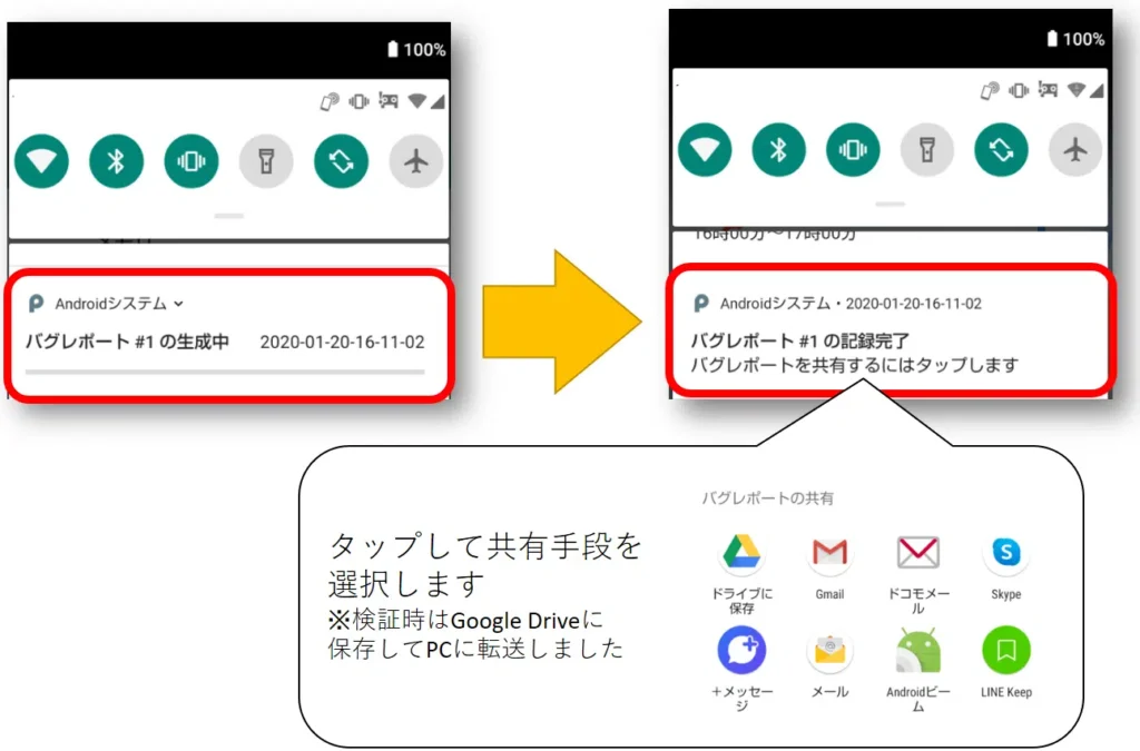 バグレポートの生成が完了後、共有を行いPCへ転送します。