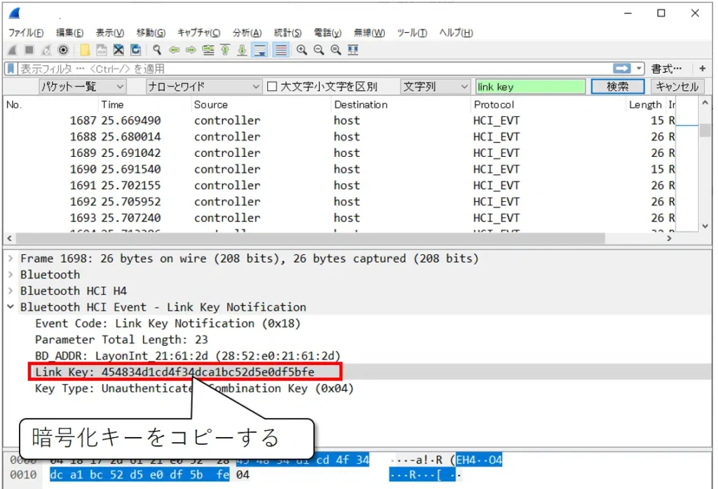 Wiresharkで開いたファイルからLink Keyをコピーします (この例ではLink Key Notification Event※より暗号化キーをコピー)。