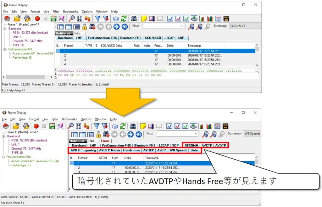 BluetoothプロトコルアナライザにLink Keyを設定することで、暗号化されていた通信が見えるようになります。