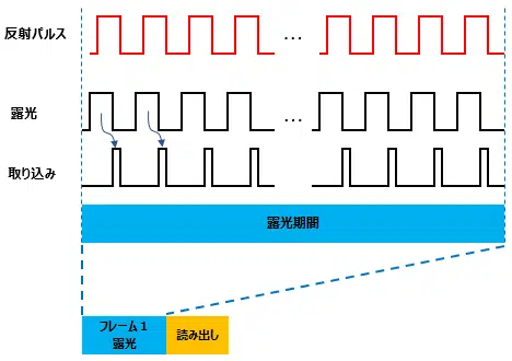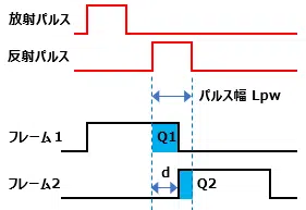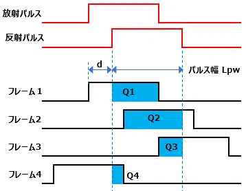 こちらも、放射パルスのタイミングは既知で、各フレームの取得タイミングも既知ですので、同様に反射パルスのタイミングが特定できます。