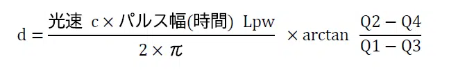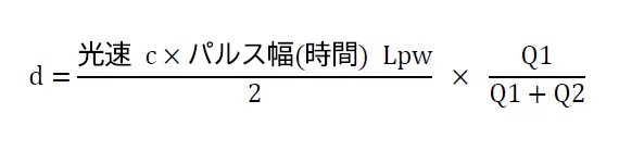 タイミングを変えて2回撮影を行い、各々で補足された電荷量をQ1、Q2とします。パルス全体の光量はQ1+Q2で、距離に換算すると、光速c×パルス幅Lpwになります。例えば、上図のdに相当する距離は、単純にQ1とQ1+Q2の比から、以下で求まります。
