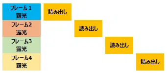 「露光→取り込み」の動作を所定の回数繰り返した後、通常通り、フレーム読み出しを行います。以上で、フレーム1が取得されます。同様の動作を、フレーム2~4についても順次繰り返します。