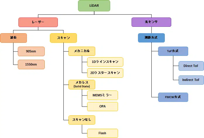 主にLiDARで用いられている技術をまとめたものが、以下のツリー図です。