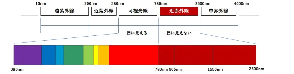 主に近赤外線波長である905nmと1550nmのレーザーが用いられます。 人がいる環境においてレーザーの出力は、目に影響を及ぼさないとされるクラス1(JIS C 6802/EN 60825-1)に制限されています。