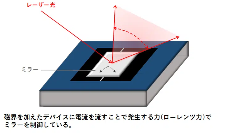 ・Micro Electro Mechanical Systemsの略称で、半導体上に形成されたミラーを制御することで、スキャンを実現します。