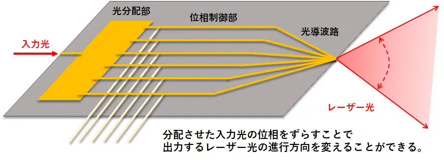 ・Optical Phased Arrayの略称で、光が回折および干渉する原理を利用し、半導体内でレーザーの進行方向を制御します。