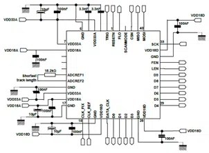 通常、リファレンスデザインがメーカーからリリースされていますので、それを踏襲します。リファレンスデザインは、アートワークまで含むことはまれで、パスコンなど周辺回路の簡単な記述であることが大半です。しかし、一般にイメージセンサの消費電力は小さくないので、電源周りの設計は重要です。電源の相互接続なども含め、まずは踏襲し、その上で、一般的な電源設計セオリーや、社内ノウハウなどを加味する方向で設計を進めます。