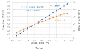 ・ 輝度バラツキはTopazの方が大きく、両者のバラツキ値の比を取ると、露光時間に関わらず1.6倍程度の値となりました。