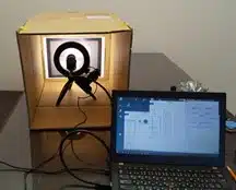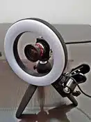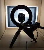 LEDリング照明を用いました。外光の影響を減じるため、カメラと撮像物を段ボールで囲んでいます。