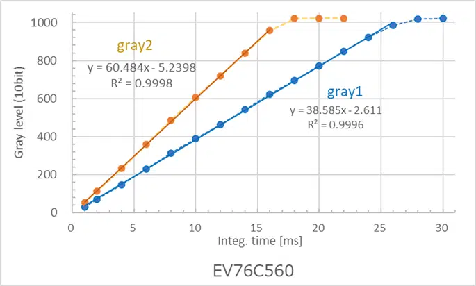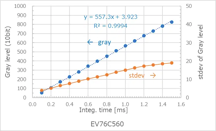 ・ 輝度は、露光時間に対し線形に増加し、上限値で飽和する一般的な特性となりました。