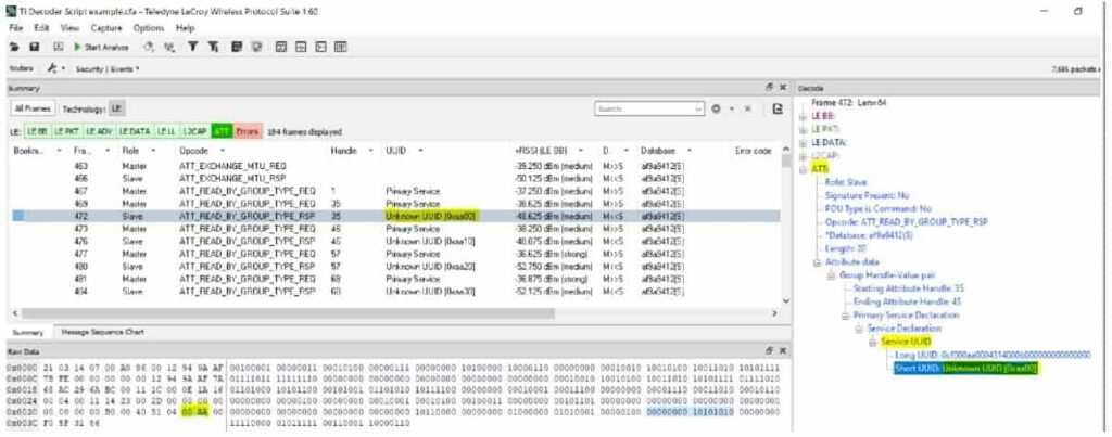 通常、Bluetooth SIGで定義されていないデータを解析すると「Unknown UUID {0xaa00}」と表示されますが、WPSではDecoderScript機能を用いてこのデータを明らかにすることができます。