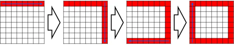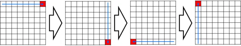 四角の描画パターンにてLEDを同じ色・同じ輝度で1点ずつ点灯させていきます。四角の描画パターンでのLEDをすべて点灯後、また同じ処理を繰り返します。