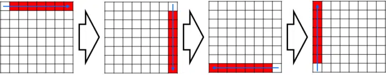 四角の描画パターンで、LEDを同じ色・同じ輝度で1点のみ点灯させていきます。
