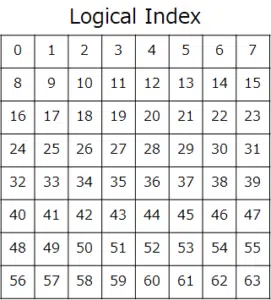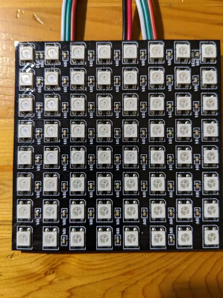 このLEDシートではWorldsemi社のWS2812Bというシリアル信号で制御可能なLEDが8行x8列、合計で64個搭載されています。64個のLEDをそれぞれ別々に制御することにより、様々なパターンを表示することができます。