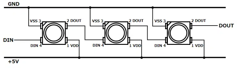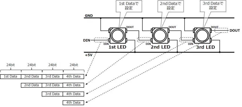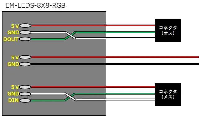 8×8 LEDシートに関しては、下記の図のように単にDIN用・DOUT用の信号ケーブルと電源用のケーブルが接続されています。