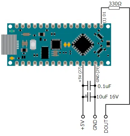 まず、DOUT用のケーブルを半田ごてなどを用いて取り外し、これをArduino側の回路に取り付けます。