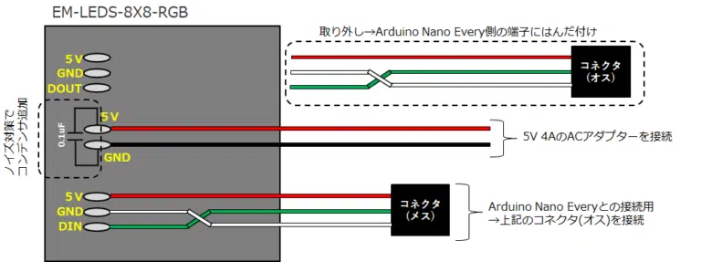 次にArduinoからの電源ラインだけでは8×8 LEDを駆動するには電流が不足するため、電源用の別途5V 4AのACアダプターを接続するようにします。