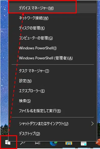 (1)Windowsのスタートメニューをクリックし、「デバイスマネージャー」を選択します。