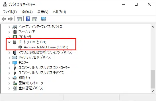 (2)デバイスマネージャーウィンドウにて、「ポート(COM と LPT)」の下に「Arduino NANO Every」があることを確認します。またCOMポート番号を確認します。下記の図ではCOM5となっています。