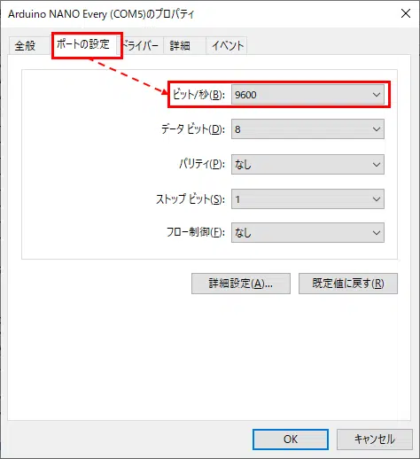 (4)「ポートの設定」タブにて、ビット/秒が「9600」であることを確認します。もし異なる場合は「9600」を選択します。