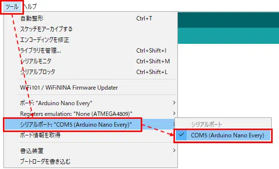 (7)「ツール」→「シリアルポート」を選択し、「Arduino Nano Every」と表示され、COMポート番号が(2)で確認したものと同じであることを確認します。