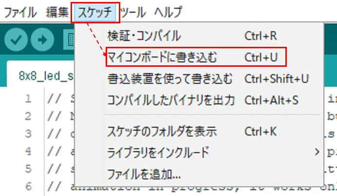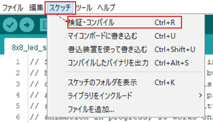 (1)まずArduino IDEで「8×8 LEDシート制御プログラム」で作成したプログラムをコンパイルします。