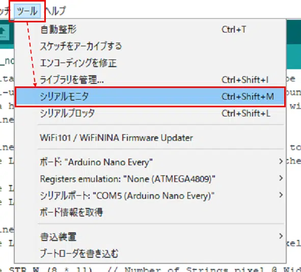 (7)「ツール」→「シリアルモニタ」を選択します。