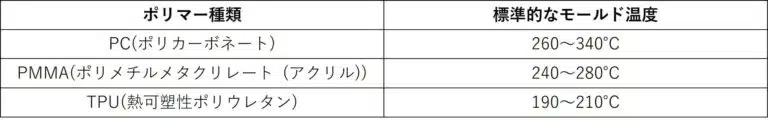 表:TactoTek社射出成形工程にて用いられる標準的なポリマー