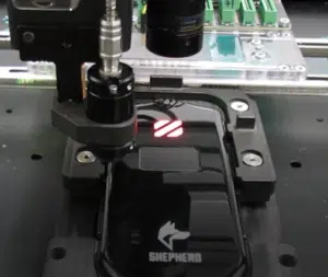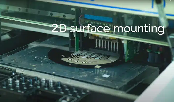 電子部品のチップを載せる箇所に、接着剤を塗り(ディスペンス)、チップマウンターを使い、電子部品をすばやく載せていきます。(動画では1:36ごろにご紹介)