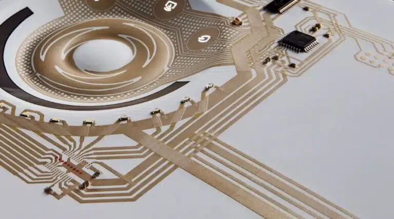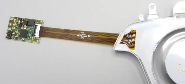 外に配線を出す場合には、この時点で、ACF(Anisotropic Conductive Film異方性導電性フィルム)という接合材を使い、FPC基板とフィルム基板上の端子同士を接合、接続する事があります。あるいは適切な圧着端子を使い、後述の射出成形でハウジングを形成することで、コネクタを設ける技術も開発されています。