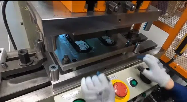 通常は大きな1枚のフィルムに複数個の製品が印刷、成形されますが、ここで、打ち抜きやレーザーカットにより、製品1個ごとに切り離します。