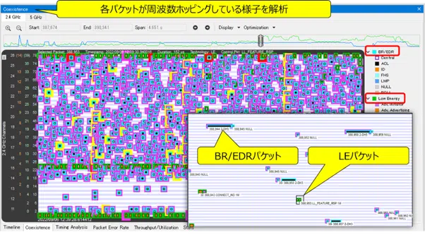 Coexistence画面では周波数ホッピングの様子が見られます。パケットはそれぞれ色分けされており、紫はBR/EDRのパケット、緑はLEのパケット、それぞれを黄色で囲まれているパケットは再送パケット、赤で囲まれたものはエラーパケットになります。そのため、黄色や赤が多い箇所では再送とエラーが多く発生していることを意味し、通信品質が落ちてしまっている部分である可能性が高いため、それぞれのパケットを確認すると改善への糸口が見つかるかもしれません。例えばDual-Modeで通信を行っている場合、BR/EDRとLEのお互いのパケットの干渉が起こる場合があります。その際に同時に解析ができれば、どのタイミングでどういったパケットによって干渉が起きてしまったかが確認することができます。
