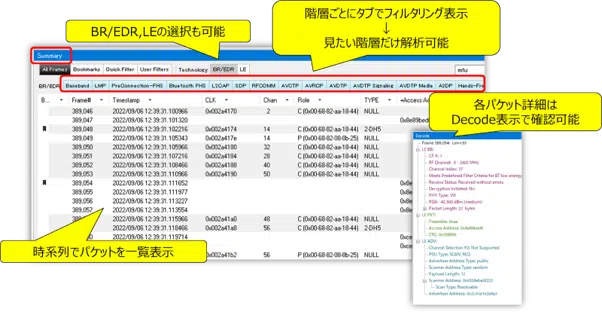 Summary画面では、機器同士のパケットのやり取りをBR/EDRとLE両方の全てのやり取りの行われたパケットを時系列順に並べています。Summary画面内のAll Framesを選択しますと、測定している全ての規格を見ることができ、Technologyで「BR/EDR」「LE」を選択することによって各規格ごとに確認することもできます。こちらを見ることによって、どのタイミングで、機器がBR/EDRとLEのそれぞれでどのようにパケットのやり取りしていたかを追うことができます。また、階層ごとでフィルタリングもされているため、アプリケーション層では見えてこなかった問題もBaseband層やLMP層で確認することができます。