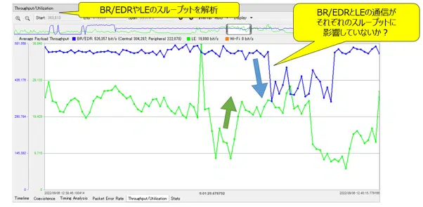 今回の例では、LEのスループットが大幅に上昇したタイミングで、BR/EDRのThroughputが大幅に減少しています。こういった変動付近のパケットを確認することによってお互いの通信がスループットに及ぼしている影響が確認できます。