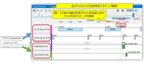 Timing Analysisではどのタイミングで、どちらの機器から、どれくらいのデータ量でやり取りが行われたかが確認できます。こちらではBR/EDRとLEでのお互いの送信タイミングを細かくみることができます。そのため、例えばスマートフォンからBR/EDRパケット送信後にLE パケットが送信されるまでのタイミングを解析できます。下の例では、同じタイミングでBR/EDRとLEのパケットが送られておりますが、このような現象が起こると、正しくパケットが送れない/受け取れない、干渉が発生するなど非効率的な通信に繋がりますので、ぜひこちらをご確認いただくことをオススメいたします。