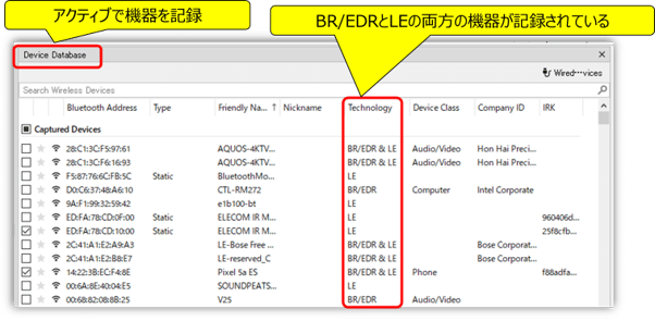 まず、WPS内のDevice Database画面では、周囲のアクティブなBluetooth機器を表示します。今回は BluetoothのBR/EDRとLEを両方測定しているため、両方の機器が表示されています。測定したい機器が表示されているか、その他にも周囲にどのような機器があるかを確認してみましょう。なお、機器に設定されている名前や搭載チップなども一覧から確認できます。