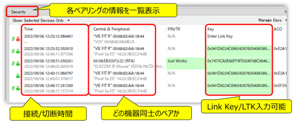 また、Security画面では各機器のペアリング情報をまとめており、どの機器がいつ接続/切断されたかを確認できます。また、こちらの画面でLink Key/LTK入力することによって暗号化されているお互いのやり取りを復号化することができ、より詳細に通信内容を確認できます。